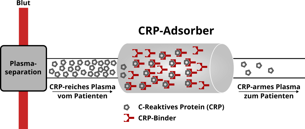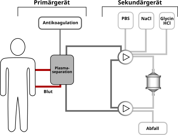 Bei der therapeutischen Apherese werden dem Körper gezielt schädliche Substanzen entzogen. Dafür wird zunächst das Blutplasma von den Blutzellen getrennt (Plasmaseparation im Primärgerät). Anschließend wird das Plasma mit Hilfe eines Sekundärgeräts über den Adsorber geleitet. Dort werden die schädlichen Substanzen gebunden. Das gereinigte Plasma wird anschließend im Primägerät wieder mit den Blutzellen vereinigt und zurück in den Patienten infundiert.